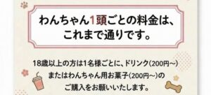 いつもご利用ありがとうございます。わんちゃん1頭ごとの料金はこれまで通りです。18歳以上の方は1名様ごとに、ドリンク(200円~)またはわんちゃん用お菓子(200円~)のご購入をお願いいたします。これからも、わんちゃんと […]